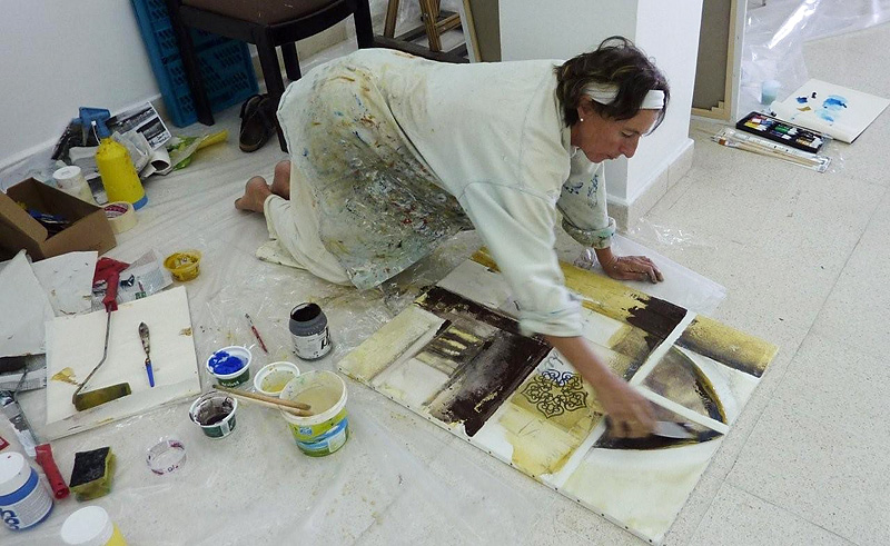 For example achieving interesting textures and a relief effect in my artwork I use lots of paint mixed with water, sand, binder, ash, marble powder and pigments. Another way is using a layering technique and adding linseed oil, bone glue or other dissolver to create exciting, unpredictable effects.